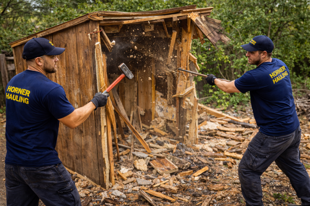 Sheds, fencing, hot tubs, and small structures removed safely — plus full haul-away included.